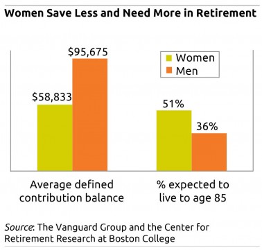 We live longer, so will need more money when we retire. Yet we work less over our lifetimes and earn 80 percent of what men earn while we are working. As a result, we’ve saved less in our 401(k)s and IRAs.