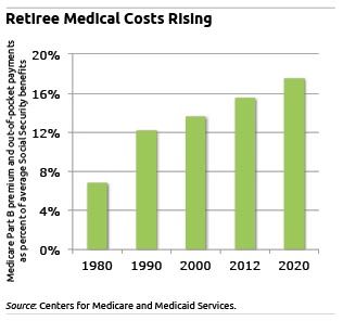 The bite taken out of Social Security checks to pay Medicare premiums and co-payments for doctor visits has more than doubled, from just 7 percent of benefits in 1980 to 15.5 percent currently.