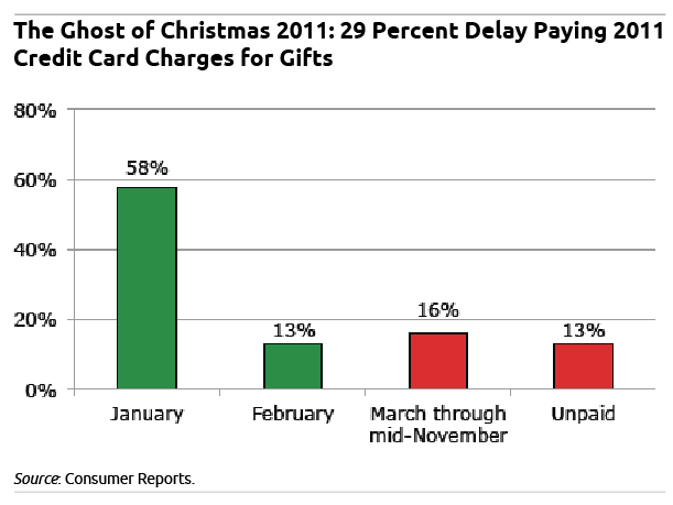 That may be one reason more Americans plan to budget this holiday season – 52 percent – compared with last year’s 41 percent, according to Consumer Reports’ national survey. Among those who bought their 2011 gifts with credit cards, 58 percent paid them off by the end of January and another 13 percent in February – hats off to them. But the rest waited. Some are still waiting.