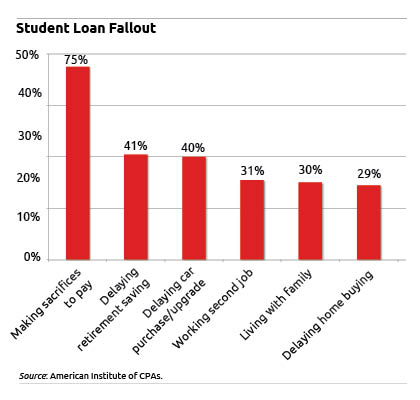 Three out of four people now paying off student debt – whether graduates or their parents – are just like Flannigan: they’re delaying important life goals in order to make their payments, according to a new survey by Harris Interactive sponsored by the American Institute of CPAs (AICPA). About 40 percent also said they have delayed saving for retirement or buying a car, to name just two deferred goals.