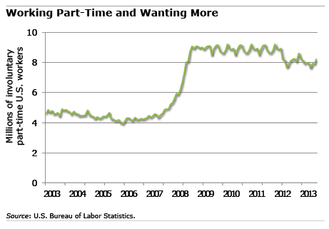 The U.S. unemployment rate has drifted down during the economic recovery. But the number of people the Department of Labor calls “involuntary part-time” roughly doubled during the recession to 8 million and still remains stuck at this much higher level.