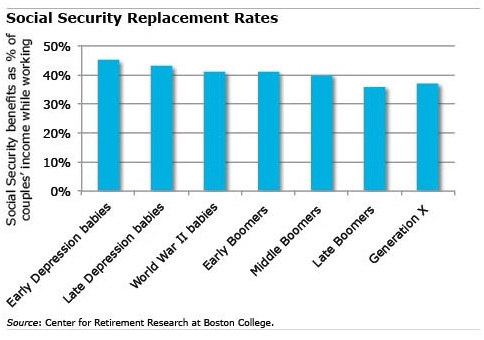 But for married couples, the sharp increase in the ranks of working wives has reduced the share of their joint earnings during their working years that is replaced by Social Security when they retire. For the typical couple born in the Depression, Social Security benefits cover 45 percent of their prior earnings, but that falls to 41 percent for baby boomer couples retiring today, according to new research by the Center for Retirement Research, which supports this blog.