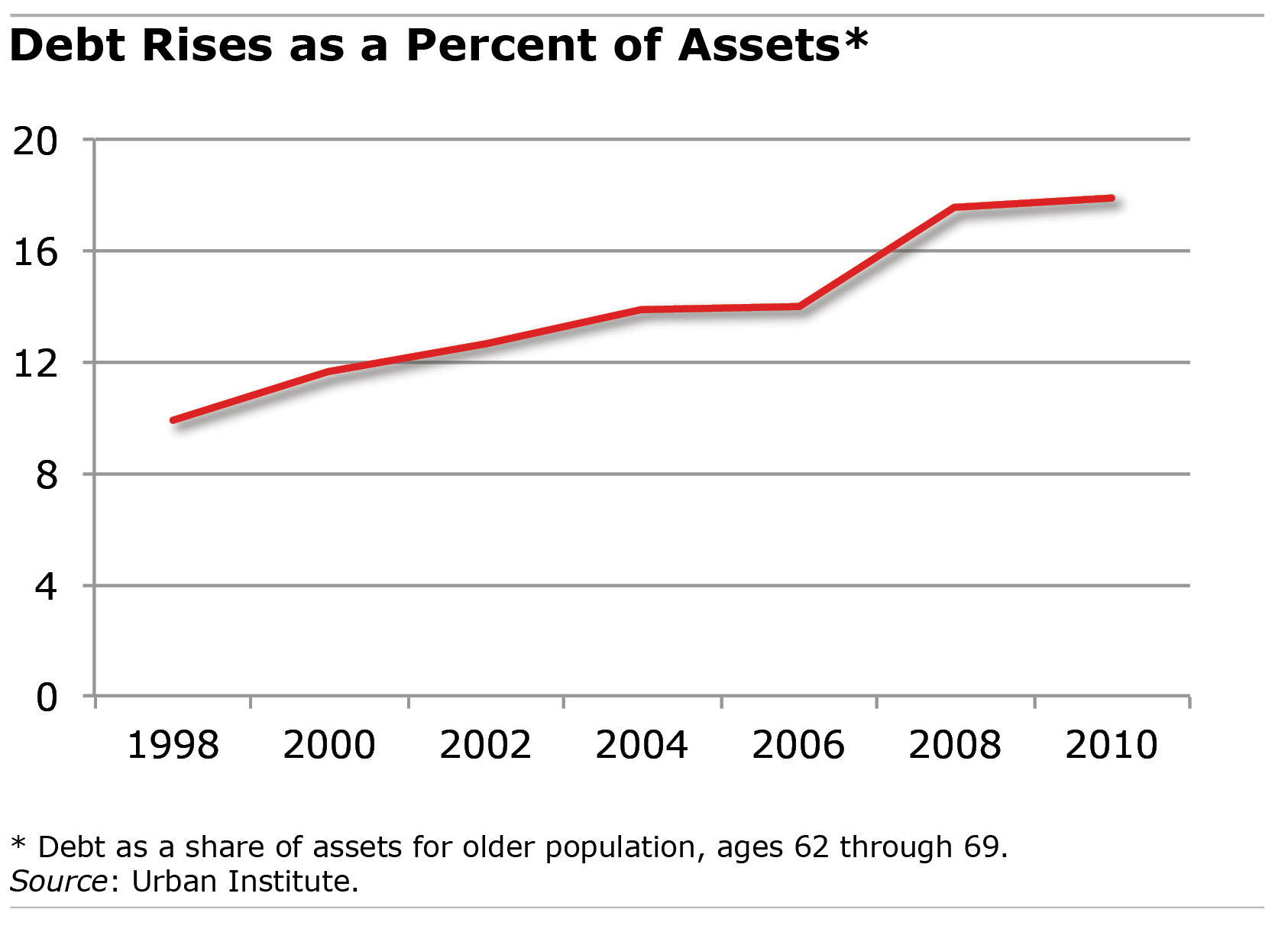 The number of people in their 60s who have debt has grown from just under half of that age group in 1998 to nearly two out of three in 2010. And their debt, as a share of their assets, has surged during that time from 10 percent to 18 percent.