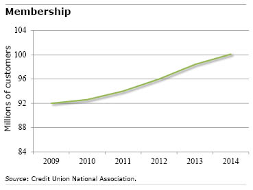 In CUNA’s newest count – the year ending 2014 – total membership increased to 100.1 million members. CUNA president Bill Hampel’s theory is the financial crisis of 2008-2009 “soured a lot of people on the big banks.”
