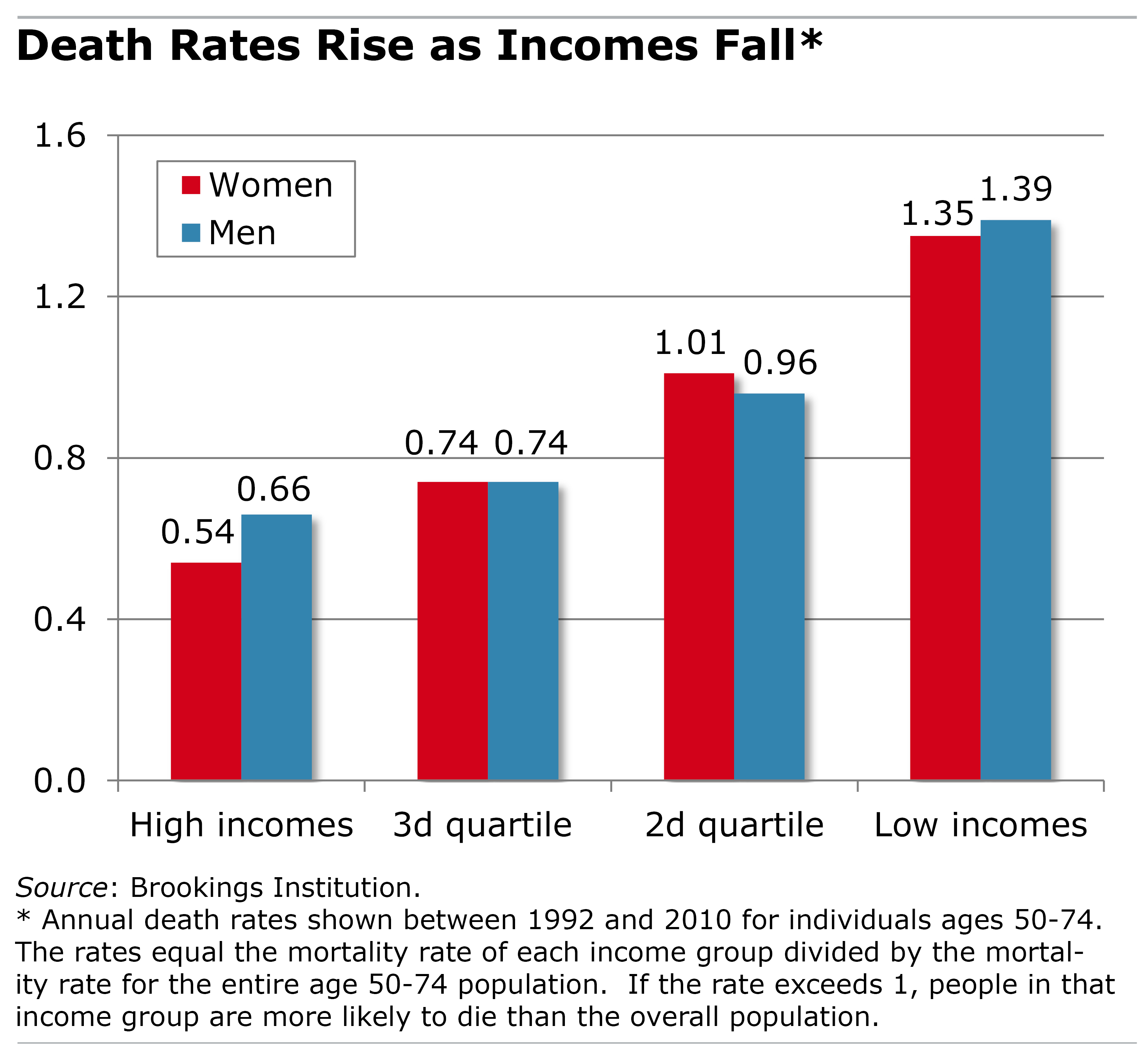 The annual death rates for 50- to 74-year-old men and women with the lowest earnings are more than double what they are for high earners.
