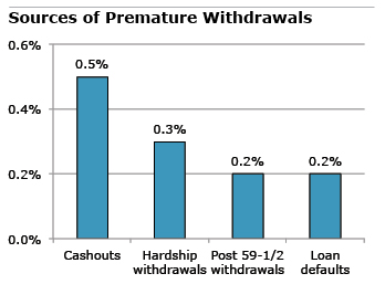This chart shows the sources and relative amounts – as a percent of total plan assets – of different types of these premature and permanent withdrawals from defined contribution plans. These estimates, by the Center for Retirement Research, which supports this blog, are based on data from the mutual fund company, Vanguard. They total slightly less than 1.5 percent, because plan participants in Vanguard’s client base earn more than the general population and may have somewhat lower withdrawal rates.