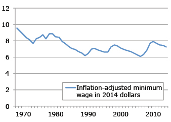The 1968 value, when translated into 2014 dollars, was $9.58 per hour, as shown in the chart (left) from the Center on Wage and Employment Dynamics at the University of California, Berkeley. In other words, today’s minimum wage, at $7.25, buys about 25 percent less than it did in 1968.