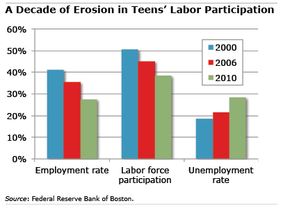 These data were highlighted in a series of recent reports by the Federal Reserve Bank of Boston expressing concern that this trend may have long-term consequences for today’s teens, including lower lifetime wages resulting from their early absence from the labor market.