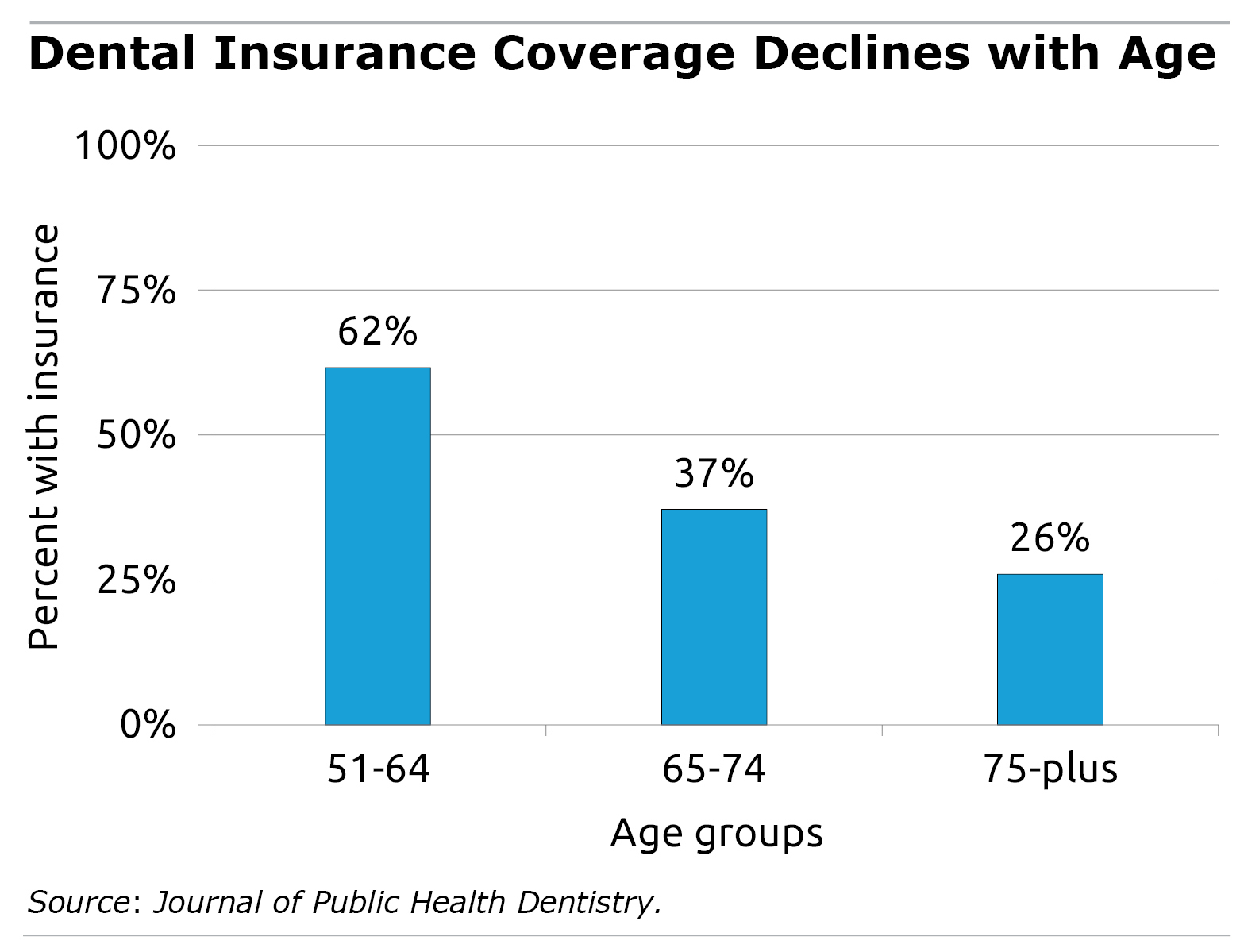 But dental coverage also drops sharply for older Americans, because when people retire, they give up their employer’s dental insurance. Without it, retirees needing dental work can face an unexpected, mini financial crisis.