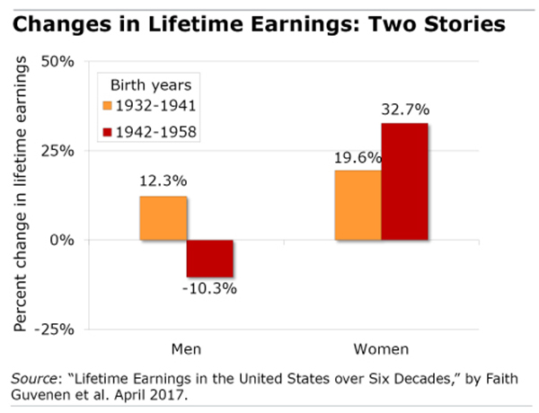 In the second phase, men’s lifetime earnings turned negative. Boomers born in 1958 have earned 10 percent less in total than men born in 1942. The decline is primarily due to men being paid less after accounting for inflation, and not from reductions in how many hours or how many years they worked, the analysis found.