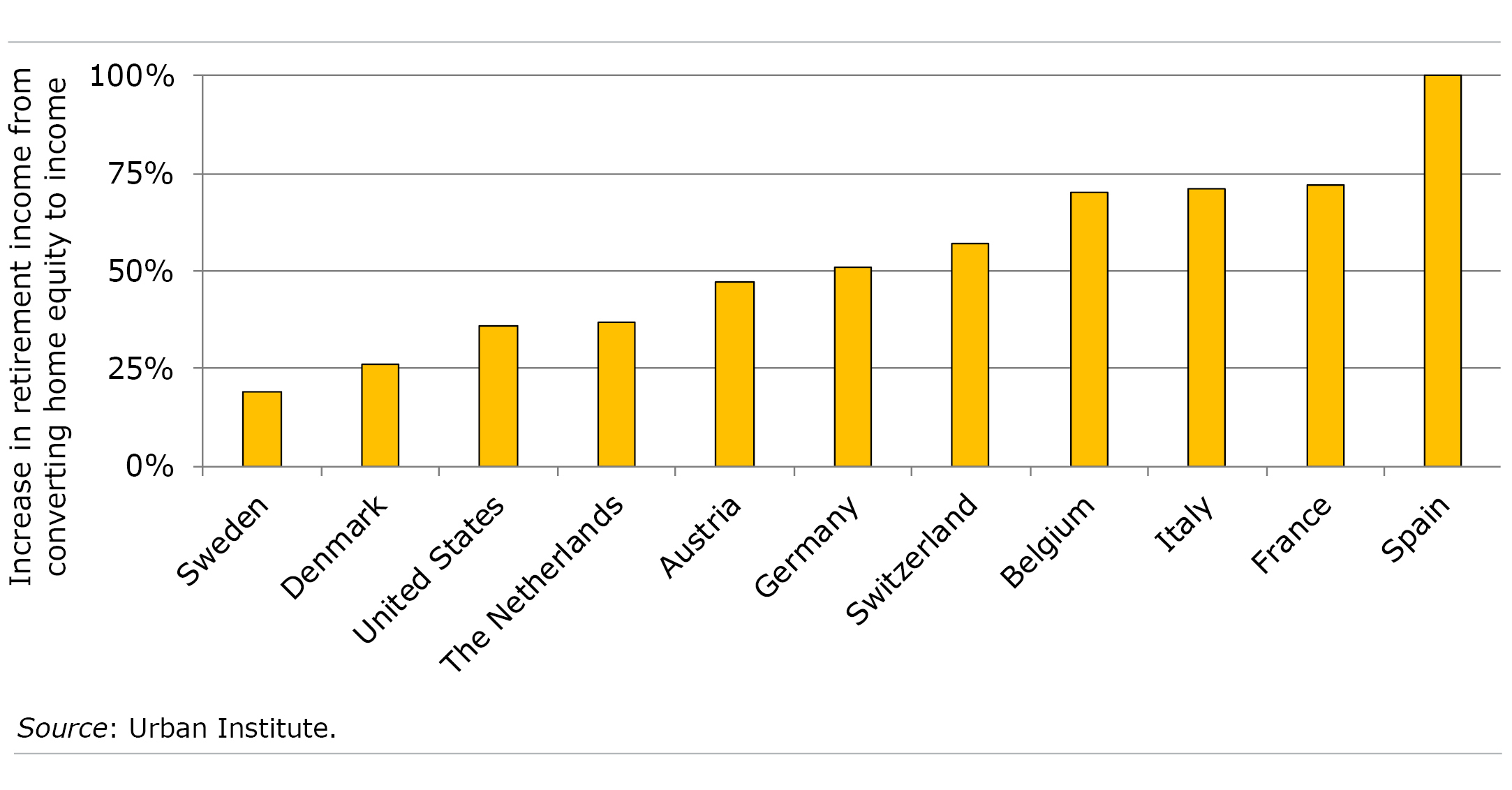 The typical retired U.S. household has the potential to increase its retirement income by 35 percent, researchers Stipica Mudrazija and Barbara Butrica estimate. In Europe, using home equity would add anywhere from 19 percent in Sweden to 100 percent in Spain.