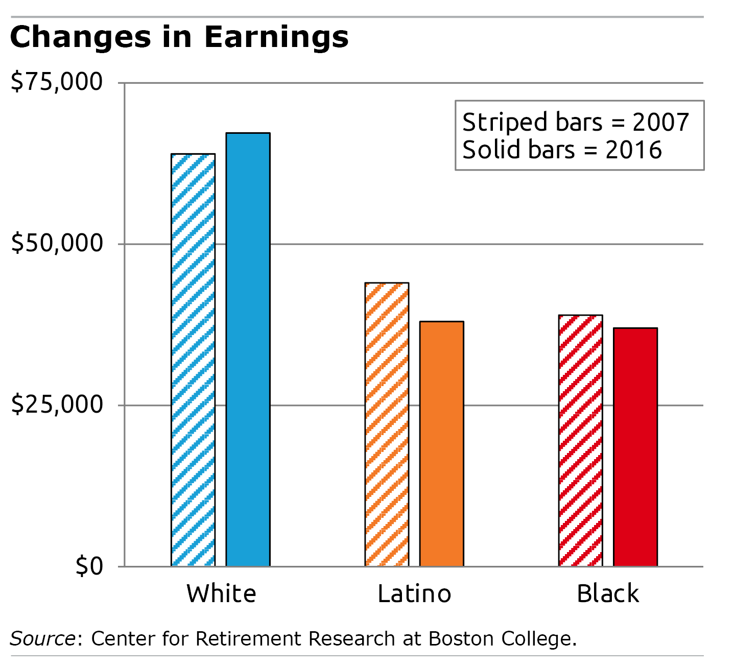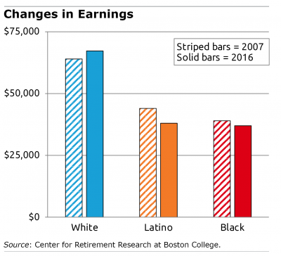 The earnings picture isn’t as dire but the gap is still large. White households are earning slightly more than they did in 2007, and blacks and Latinos are not. In 2016, white Americans had two times more income than either minority group.