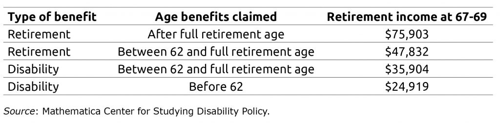 A 2018 study in the Journal of Disability and Policy Studies quantifies the financial fallout. Four groups were compared, each ranging in age from 67 to 69. One started receiving disability benefits sometime between 58 and 62. A second group went on disability between 62 and Social Security’s full retirement age, which is 66 for most boomers. The other two groups claimed their regular retirement benefits. One signed up between the earliest age allowed – 62 – and the full retirement age, and one started their benefits after the full retirement age, which yields a larger monthly check.