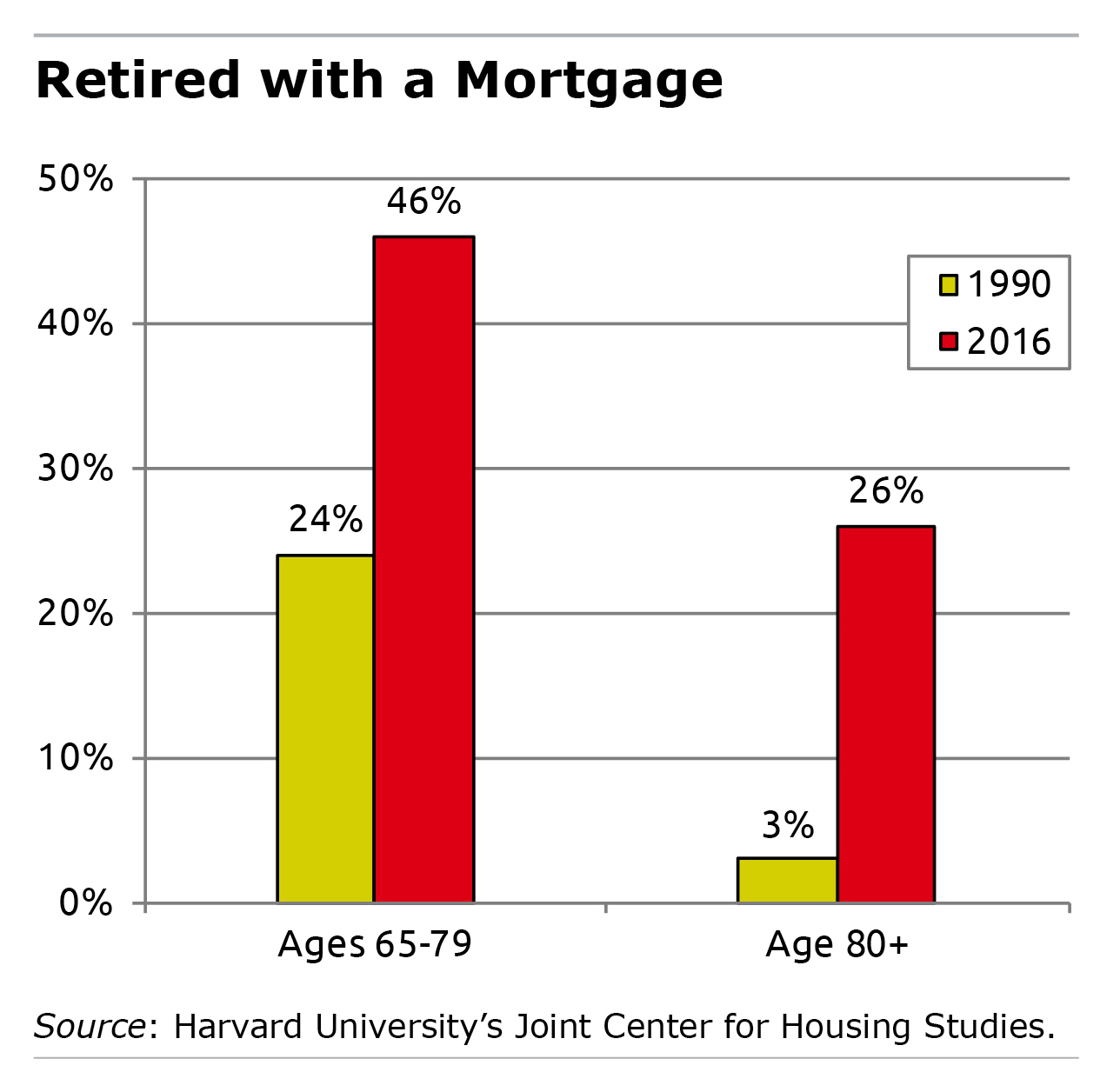 Thirty years ago, just one of every four homeowners in their late 60s to late 70s still had a mortgage – today, nearly half do. Once people hit 80, mortgages used to be extremely rare – only 3 percent had them. Today, it’s one in four, Harvard’s Joint Center for Housing Studies recently reported.