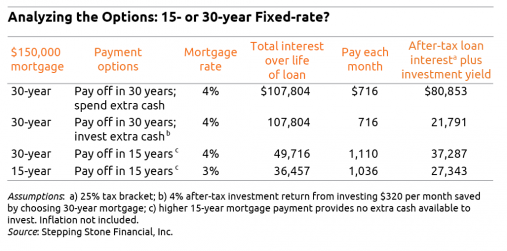 Here are the facts. A 15-year loan gets paid off faster but the monthly payment is higher; a 30-year mortgage with a lower payment provides the flexibility either to invest the extra cash or pay off the loan faster.