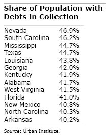 West Virginia, North Carolina, Alabama, Kentucky, Texas – they’re among 13 states where more than four in 10 state residents’ credit card or other debts have been sent to collection agencies, according to a July report by the Urban Institute.