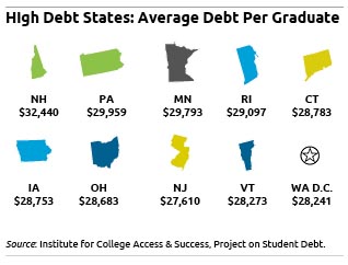 For example, the 10 states with the highest share of graduates in debt after attending four-year institutions in those states are: North Dakota (83 percent), New Hampshire (79 percent), Maine (78 percent), South Dakota (75 percent), Rhode Island (74 percent), Massachusetts (72 percent), Pennsylvania (71 percent), Minnesota (70 percent), Connecticut (69 percent), and Missouri (67 percent).