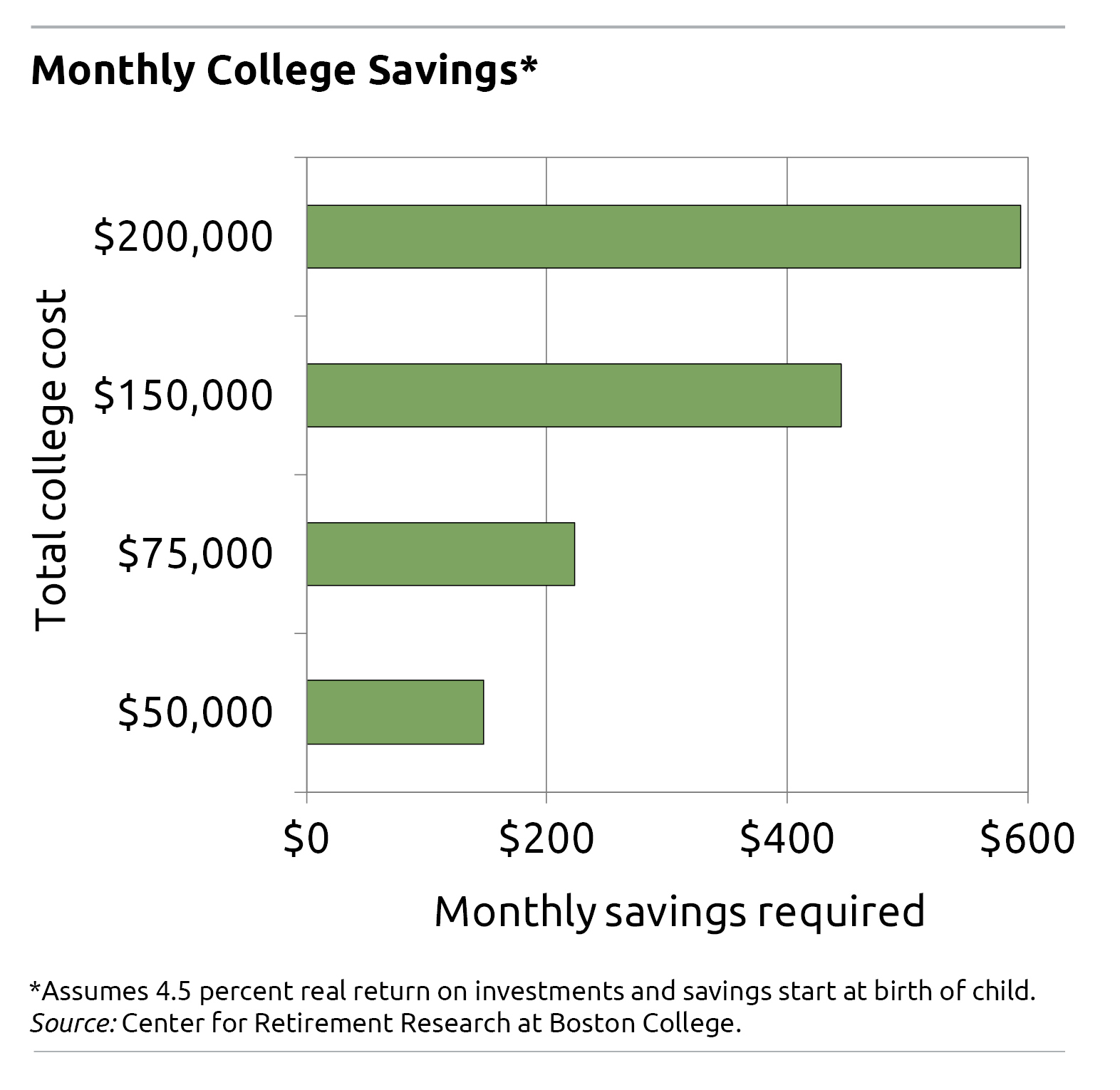 The use of 4.5% as the real return assumption is highly questionable. It assumes taking significant risk in the portfolio funding college tuition. But in your graphic there is no indication of the monthly savings required in a worst-case scenario. If instead one assumes a safe investment strategy of investing in U.S. Treasury Series I Saving Bonds then the real rate of return to assume is zero rather than 4.5%. This makes a huge difference in the monthly savings required. There are 216 monthly contributions over 18 years. Each one would have to be $926, not $600, for the $200,000 total tuition estimate shown in your graphic. Visit the U.S. Treasury’s Savings Planner.