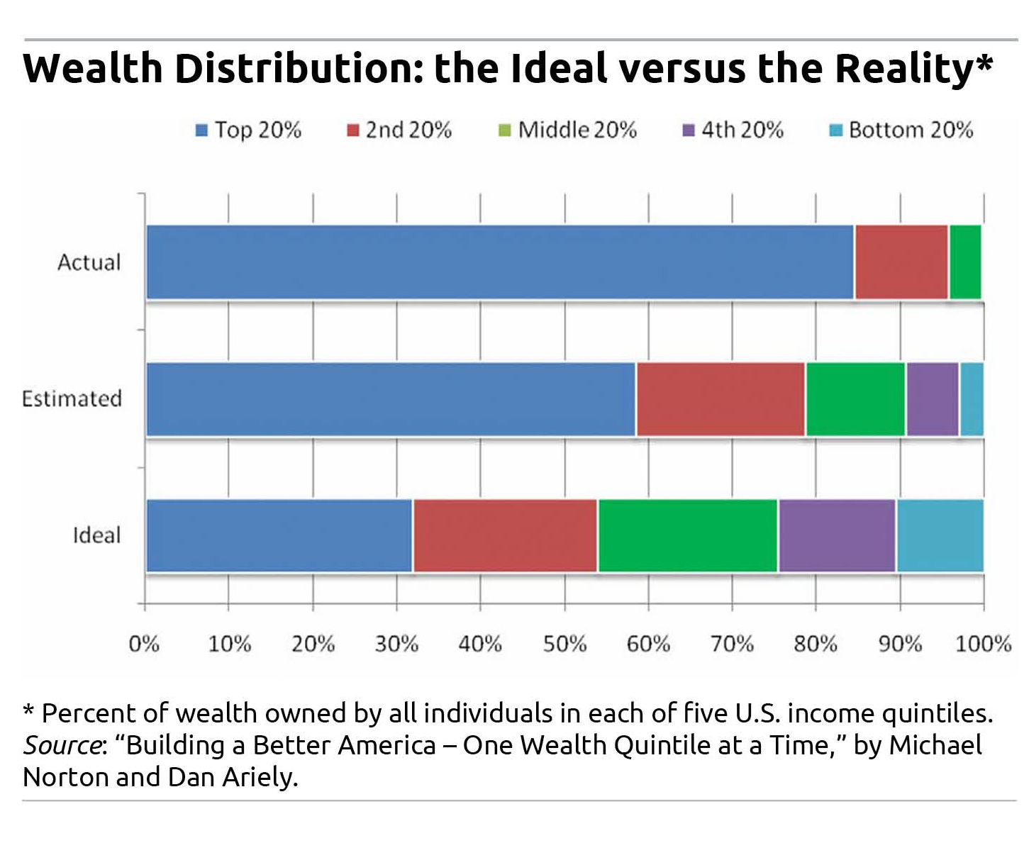 A Harvard Business School professor – Michael Norton – and a behavioral economist – Dan Ariely – teamed up to ask people their preferences when it comes to the distribution of wealth. They found that Americans of all types and political affiliations “vastly underestimated” the magnitude of the difference between rich and poor in this country.