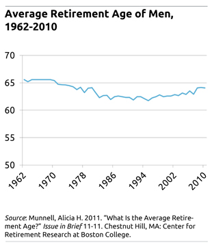 The average U.S. age for men retiring from work has gradually increased to 64.  Yet age 62 continues to be held out as the popular standard, perhaps because that’s Americans’ marker for Social Security eligibility.