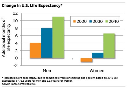 Women, who were slower to cut back on smoking and have done so to a lesser degree than men, will experience those health benefits later. Women who are now 40 have a longer life expectancy than men – age 82 – but obesity patterns will actually decrease that life expectancy slightly through 2020.