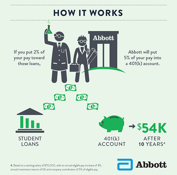 The company began the program after receiving a special IRS ruling that permits Abbott to give a 401(k) contribution to an employee who makes payments toward student loans, preserving the retirement plan’s tax-exempt status.