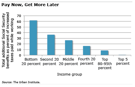 By this measure, the effects are strongly progressive: those at the bottom of the income scale would see much larger increases in their benefits, mirroring Social Security’s progressive benefit formula.  The value of the benefit increases shown in the above chart ranged from 62 percent of the additional taxes paid by the lowest-income workers to 26 percent in the middle to less than 1 percent for those in the top 5 percent.