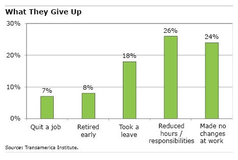 Three out of four caregivers have made changes to their jobs as a result of their caregiving responsibilities, whether going to flex time, working part-time, quitting altogether, or retiring early, according to a Transamerica Institute survey. To ease the financial toll, some caregivers dip into retirement savings or stop their 401(k) contributions. Not surprisingly, caregiving places the most strain on low-income families.