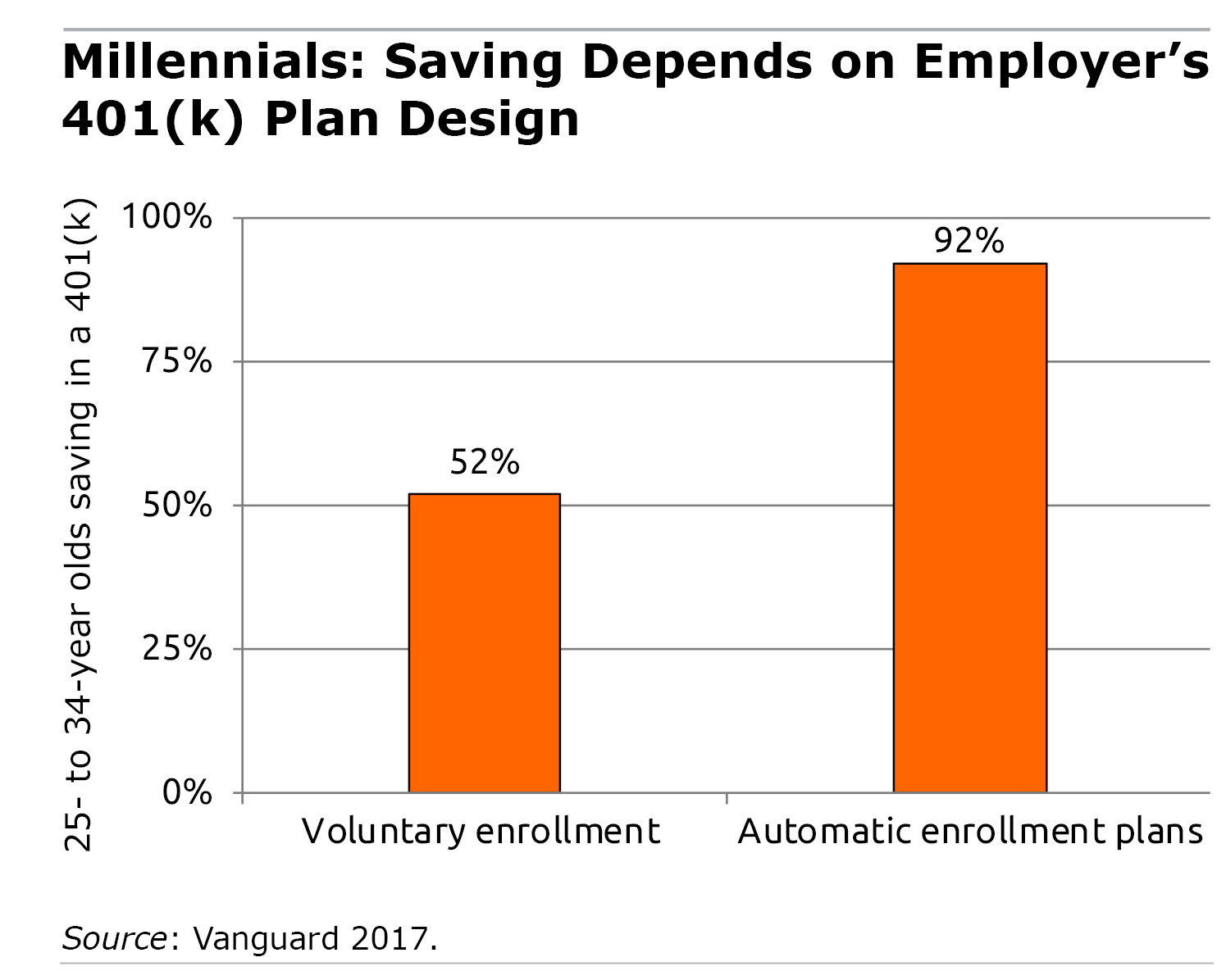 The strategy seems to be working: 92 percent of workers in their mid-20s to mid-30s whose employers have auto-enrollment are contributing part of their paychecks to their 401(k) plans, according to Vanguard. Contrast that to just 52 percent of workers in this age group whose employer plans are voluntary.